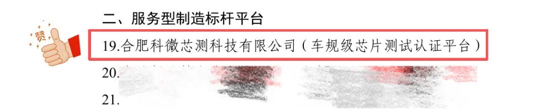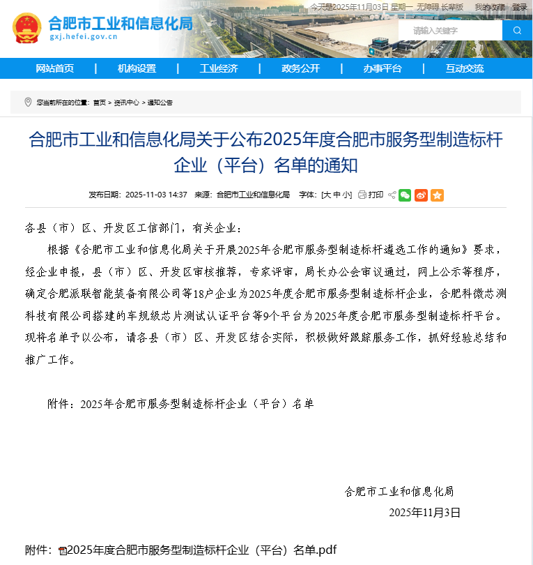 11月3日,合肥市工业和信息化局发布《合肥市工业和信息化局关于公布2025年度合肥市服务型制造标杆企业(平台)名单的通知》,合肥科微芯测科技有限公司搭建的车规级芯片测试认证平台入选为2025年度合肥市服务型制造标杆企业(平台)。
